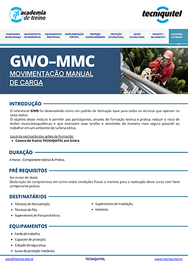 O curso de GWO – Movimentação Manual de Carga realiza-se no nosso Centro de Treino TECNIQUITEL em Sintra.